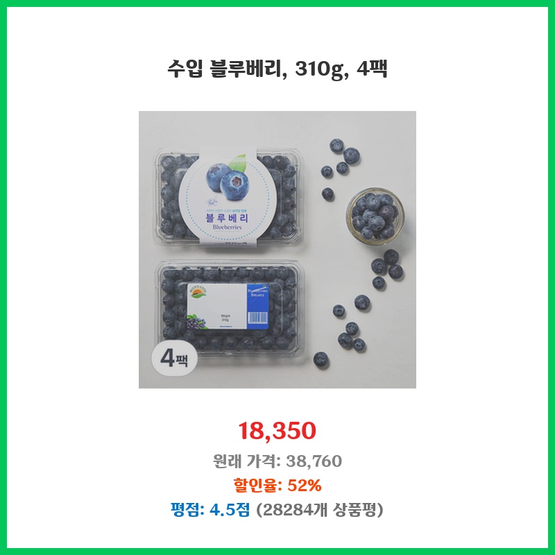 수입 블루베리는 크고 달콤하며 신선합니다. 4팩이라 편리하게 나눠 먹을 수 있어서 마음에 들어요. 아침에 요거트에 넣어 먹으면 하루를 밝게 시작할 수 있죠.