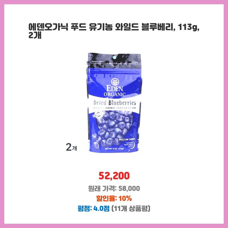 에덴오가닉 블루베리는 신선하고 맛있어요! 싱싱한 과일의 풍부한 맛이 돋보입니다. 아침 스무디에 넣거나 그냥 즐기기에 완벽해요.